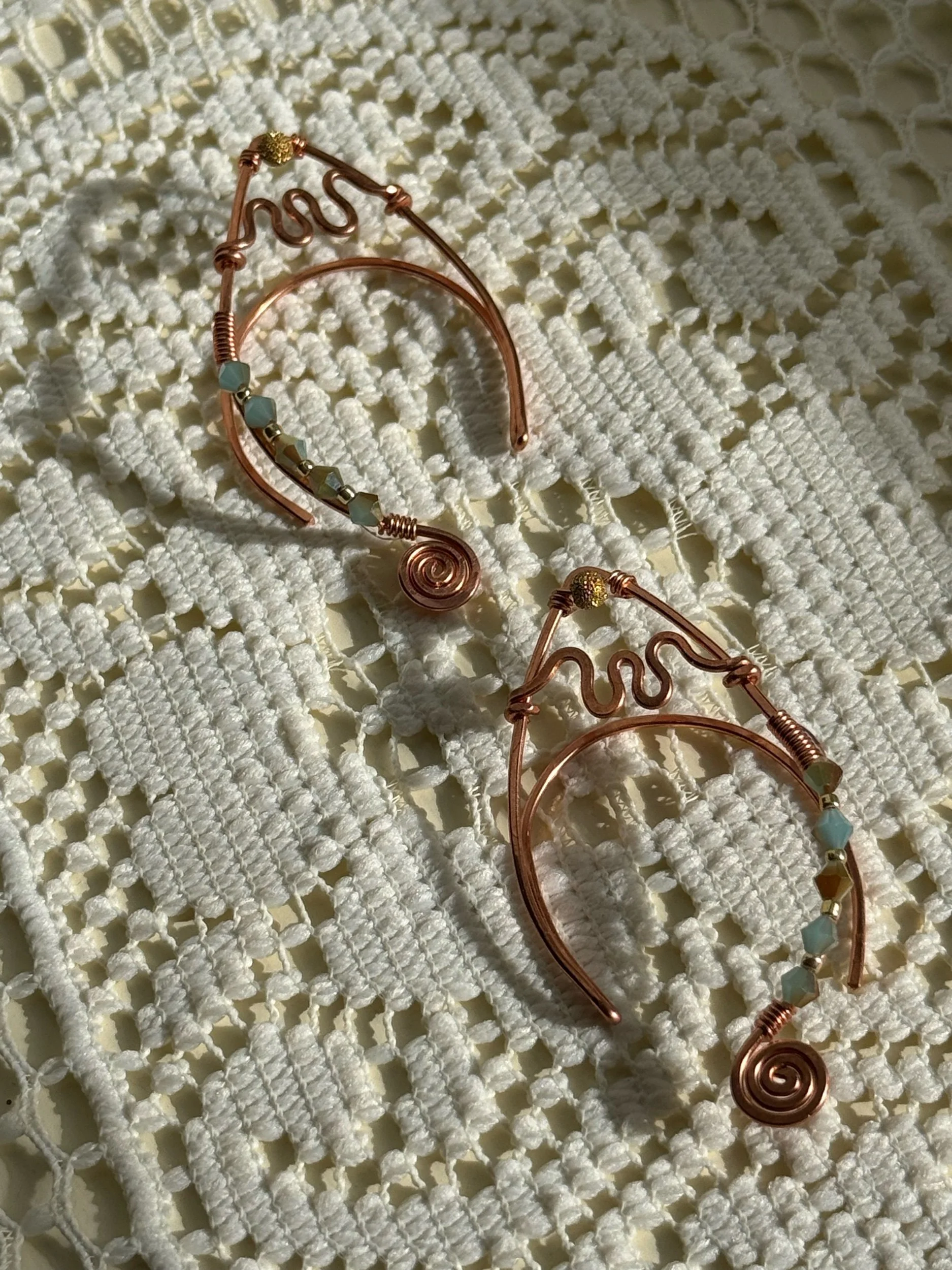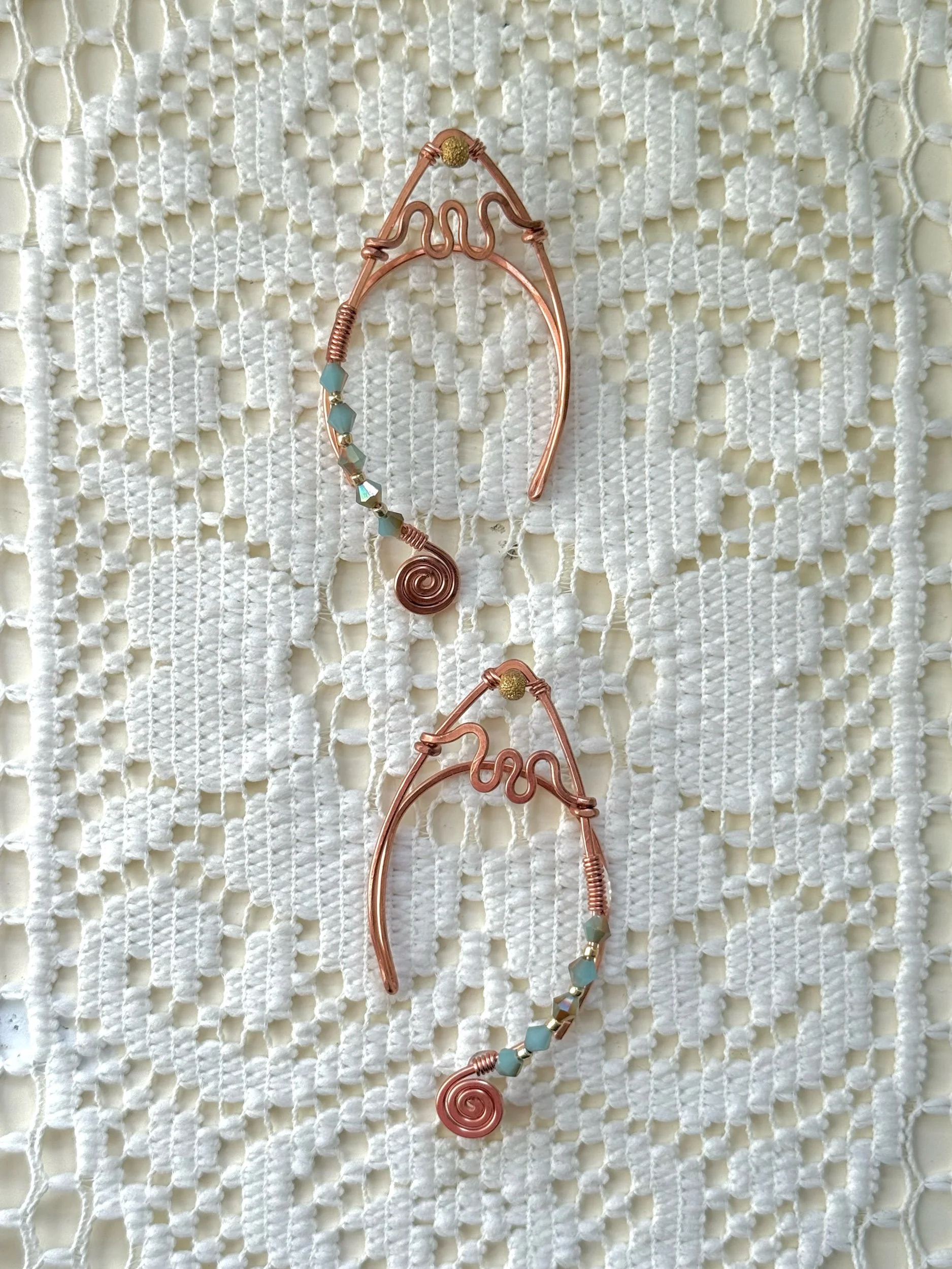 This one-of-a-kind ear cuff set is hand-formed in pure copper. Ordained with authentic Swarovski crystal beads in a hue reminiscent of calm, tropical waters. Featuring gold accents and whimsical spirals to enchant the ears that wear them.