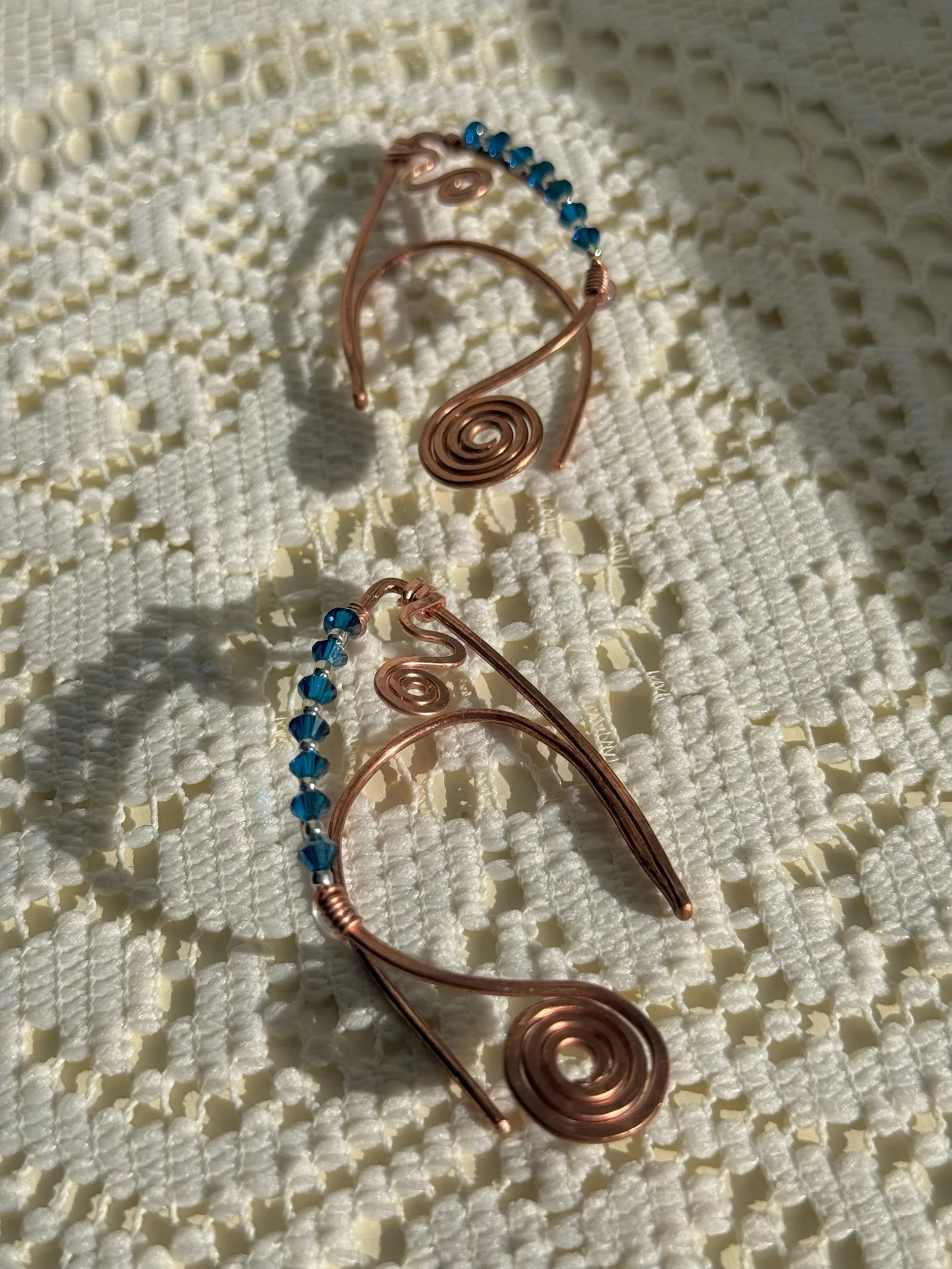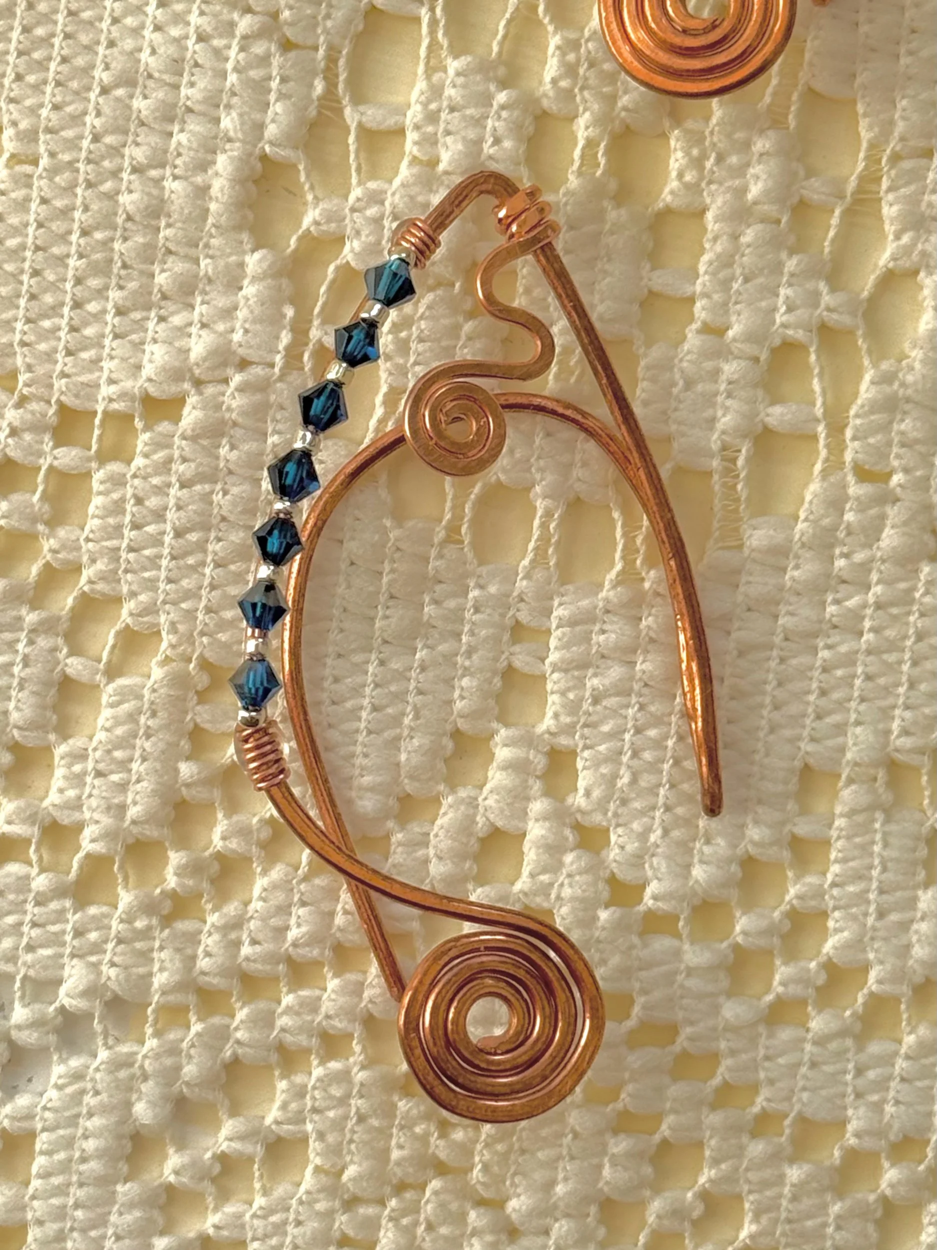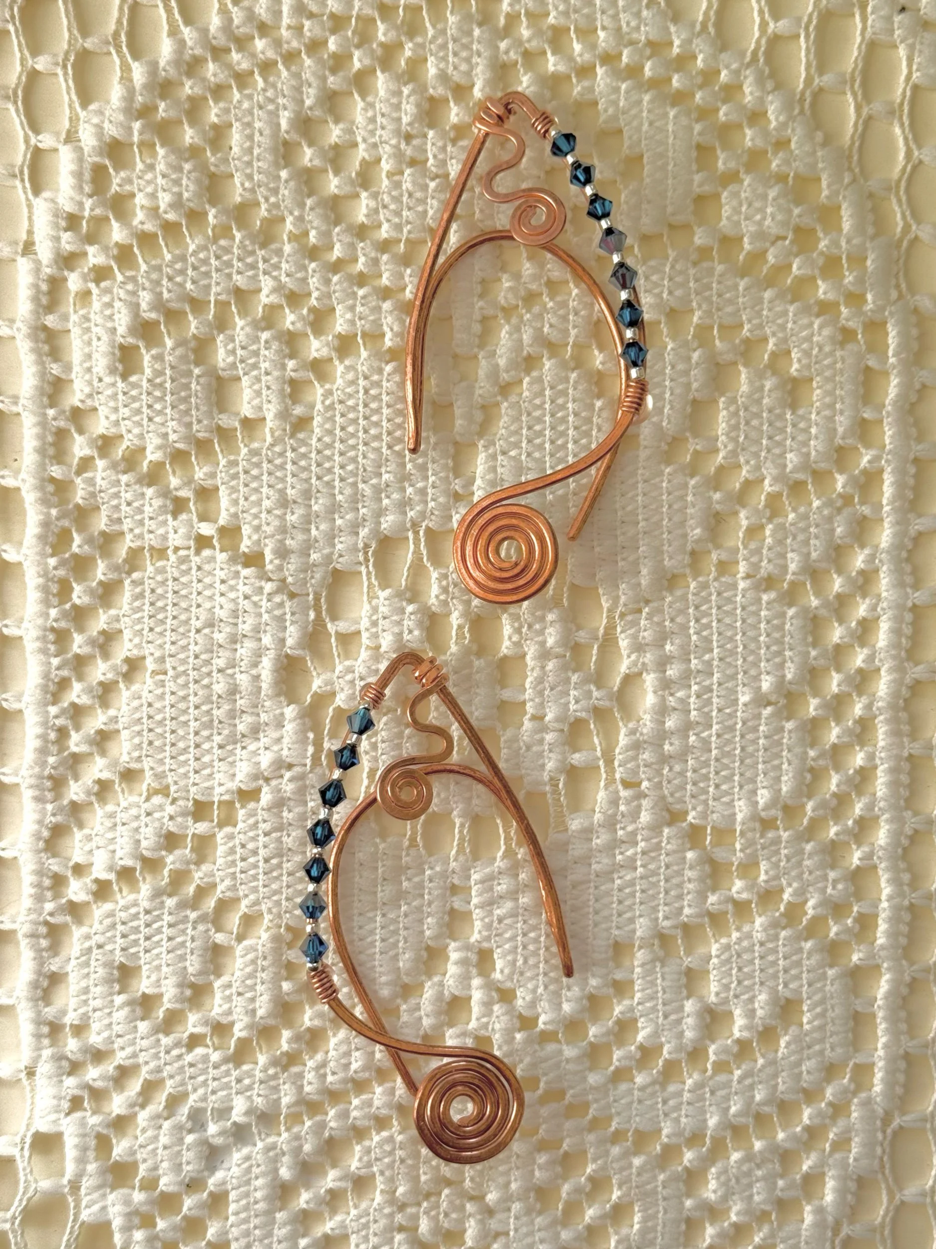 This one-of-a-kind ear cuff set is hand-formed in pure copper. Ordained with authentic Swarovski crystal beads in a shade of deep sapphire. Featuring silver accents and whimsical spirals and swirls to enchant the ears that wear them.